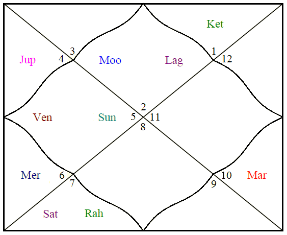 In Lord Krishna horoscope Fourth house lord is Sun. This Sun fourth house lord is conjunct with sixth house lord and eight house and twelfth house lord aspects the fourth house. When sixth, eight, twelfth house lords connects with fourth house, shows native may not get the love of mother or mother may suffer or can be reason to born away from home. Like born in third house dasha, with fourth house under affliction will show native will move away from home soon after birth. Lord Krishna was born in Rohini Nakshatra which is of Moon which is third house lord in Lord Shri Krishna horoscope.