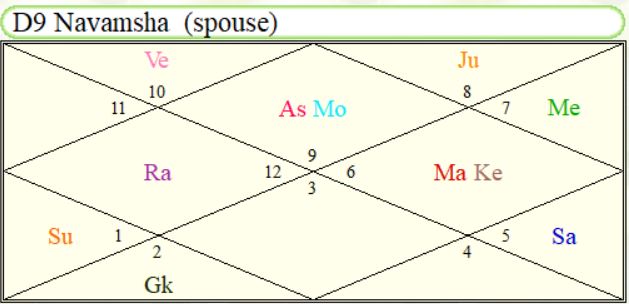 - In Navamsha Chart, Sun and Mars are in mutual aspect. Sun in eleventh house and Mars in fifth house. Three points above(including this point) makes her aggressive in nature. Plus there is Unmad Yoga also there. Which means she can take decision very quickly in anger state. Remember Saturn is seventh house as well as eight house lord. Moon and Mars are again conjunct together in Navamsha Chart.