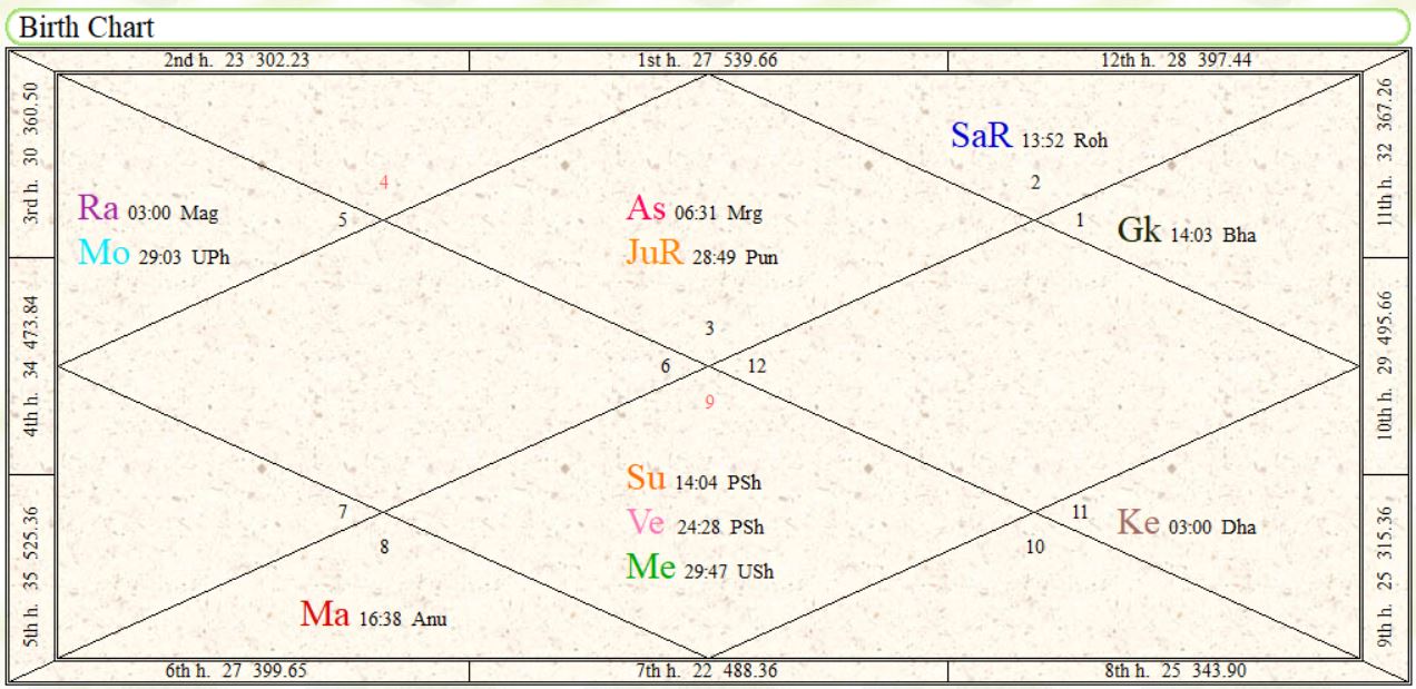 Let’s look at the horoscope of Rahul Dravid who has kahala yoga in his birth chart.