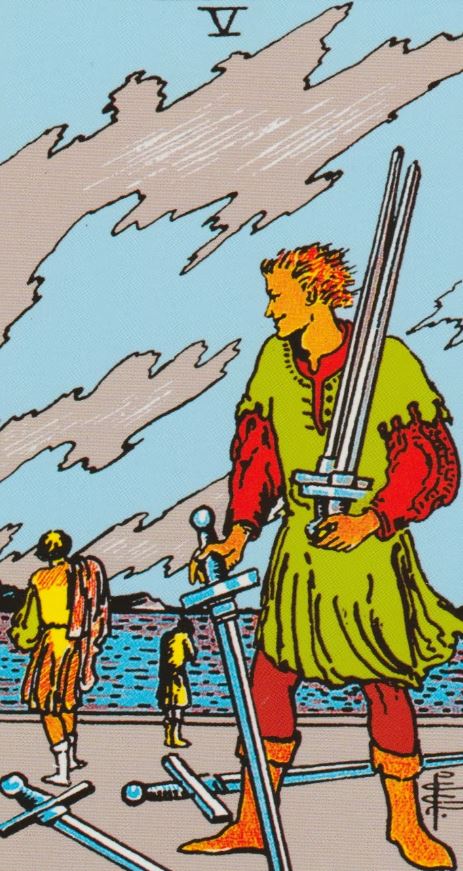 First Card – What brings love partner together – Five of Swords in Love Tarot Reading