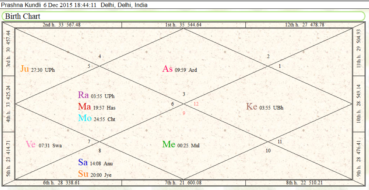 In case if we have natal horoscope also (with accurate time of birth) then it should be also check. Any event which is promised in birth chart and if it’s also repeating in Prashna Kundli Chart then that event is sure to occur.  In cases where when the birth chart is not available, the prashna chart not just only reveals about the present query but it can also be read as the birth chart giving amazingly great results.