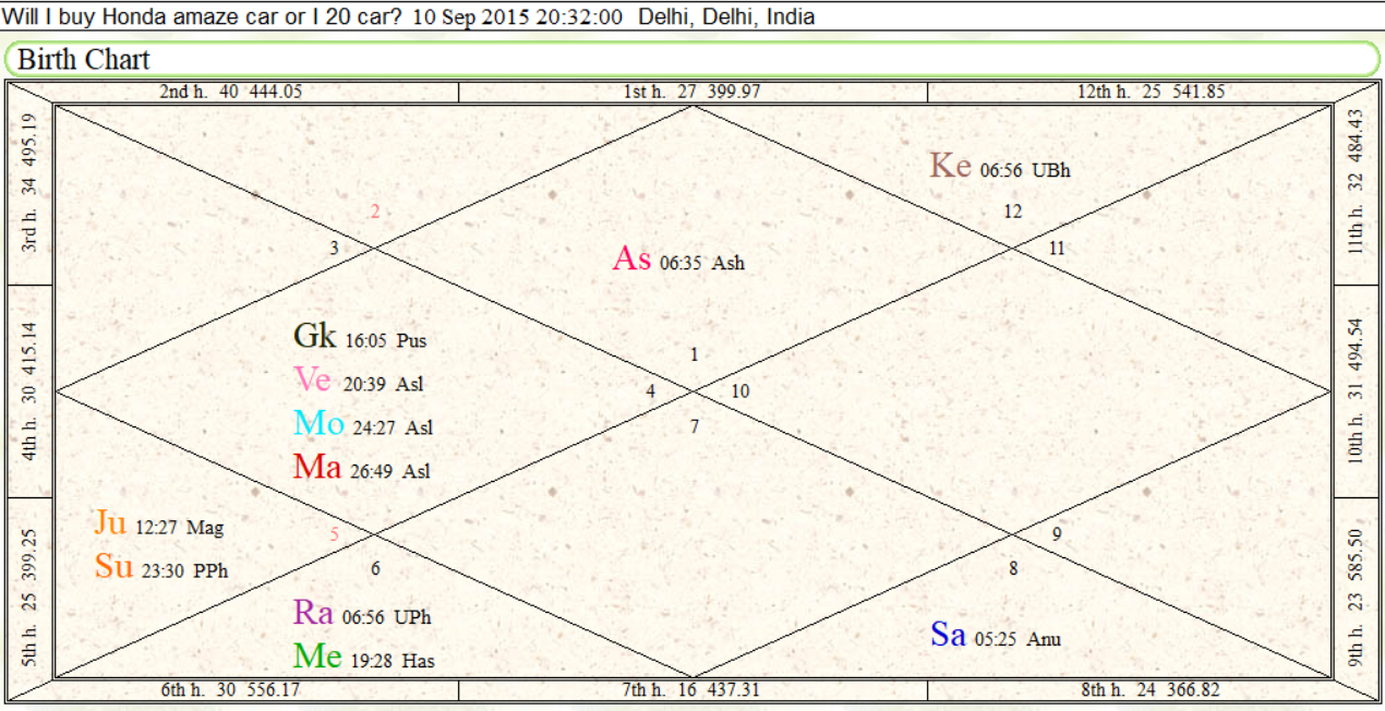 Person has two options in his mind. He was looking to buy car and was totally confused and tossed between two car options. Now we have to see which option is showing more chances. First option we take as Ascendant plus its lord and Second option as seventh house and its lord.Here is the question below by client.